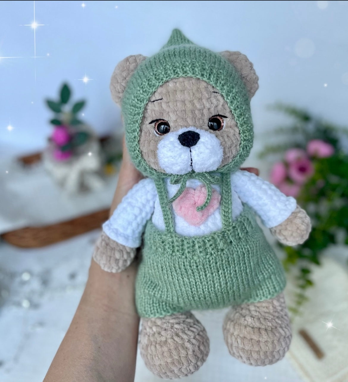 Teddy is a gentle little friend, handcrafted with care and patience — stitch by stitch.