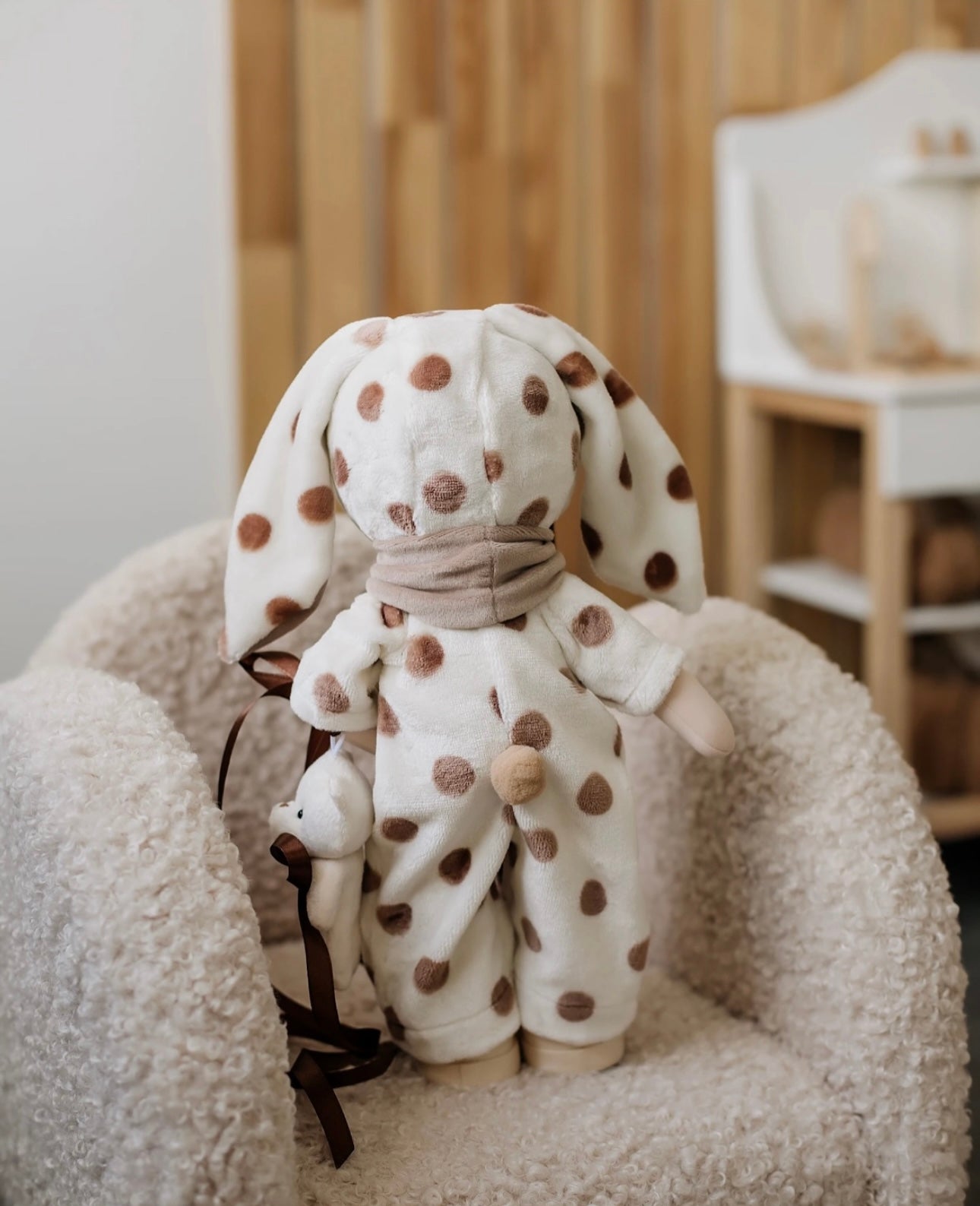 Her cozy bunny outfit, warm neutral tones, and calm expression create a sense of safety and tenderness.